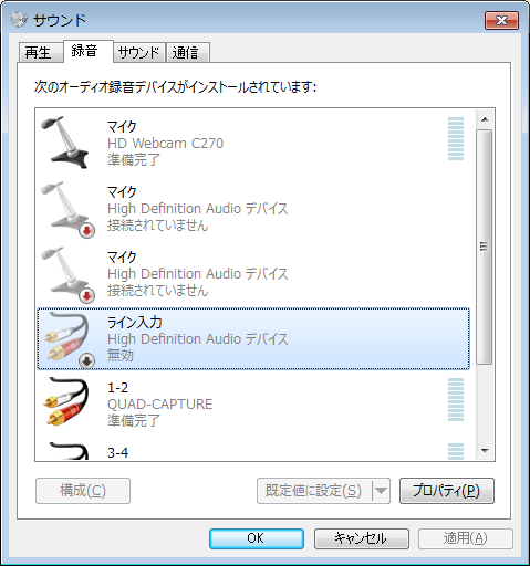 スマホやタブレット(以下タブレットと呼ぶ)のヘッドホン端子にステレオミニケーブルを挿し、それをPC背面のライン入力端子(青色の穴)に繋ぎます。ケーブルを繋いだら、PC側でライン入力を有効にします。