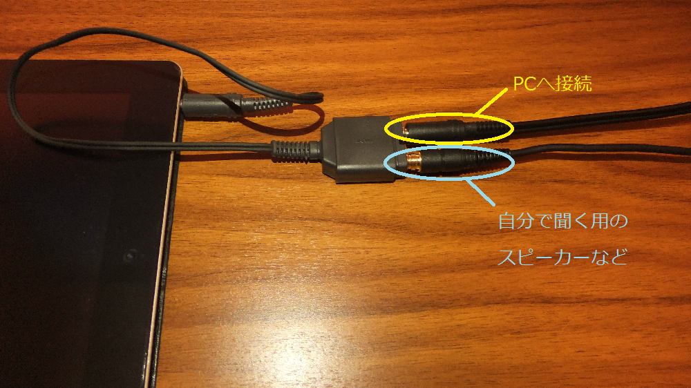 タブレットに分岐コネクタを挿し、片方は先程と同じ様にステレオミニケーブルでPCと接続します。もう片方には、自分で聞く用のイヤホンやスピーカーを接続します。