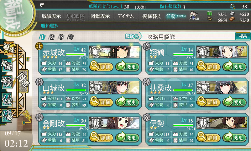 若干経験値が足りないのと、戦艦勢の装備が初期装備なのはちょっと痛いかもしれませんが、面子は揃ってるので、毎日1回2回挑戦していきます。